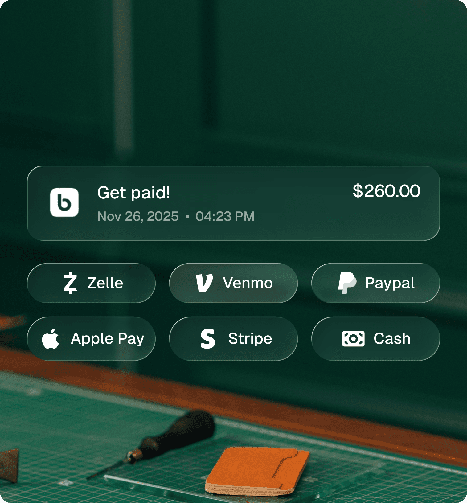 Accept payments, collect tips, add travel fees, sell add-ons, and get instant payouts.